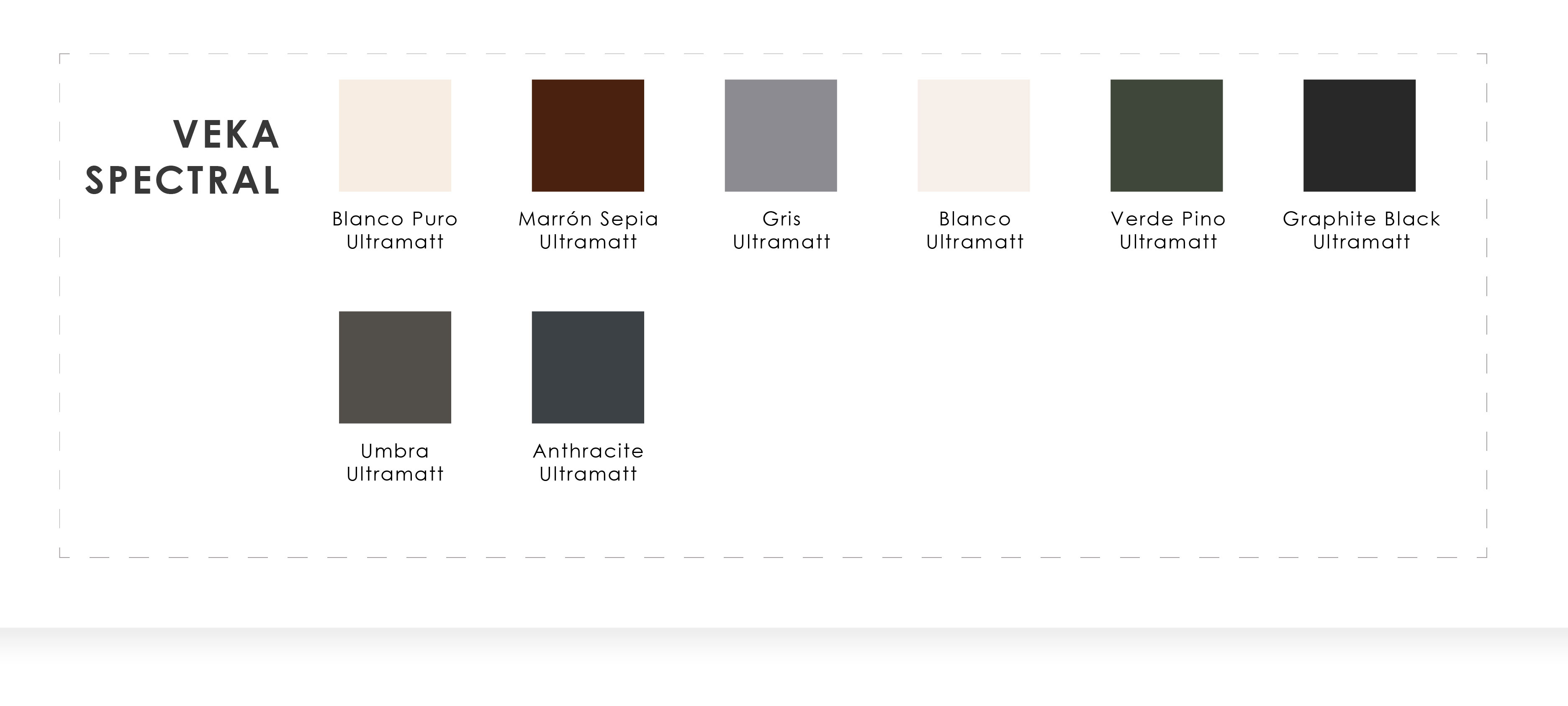 VEKA SPECTRAL nace para ofrecer a sus clientes una amplia gama de colores, en continuo desarrollo, para dar respuesta a cualquier exigencia de diseño y adaptarse a las cambiantes tendencias arquitectónicas. Es la solución perfecta para proyectos que buscan la diferenciación. VEKA SPECTRAL es el fruto de la labor innovadora del Grupo VEKA y constituye un punto de inflexión en el diseño y la fabricación de perfiles de PVC para puertas y ventanas.